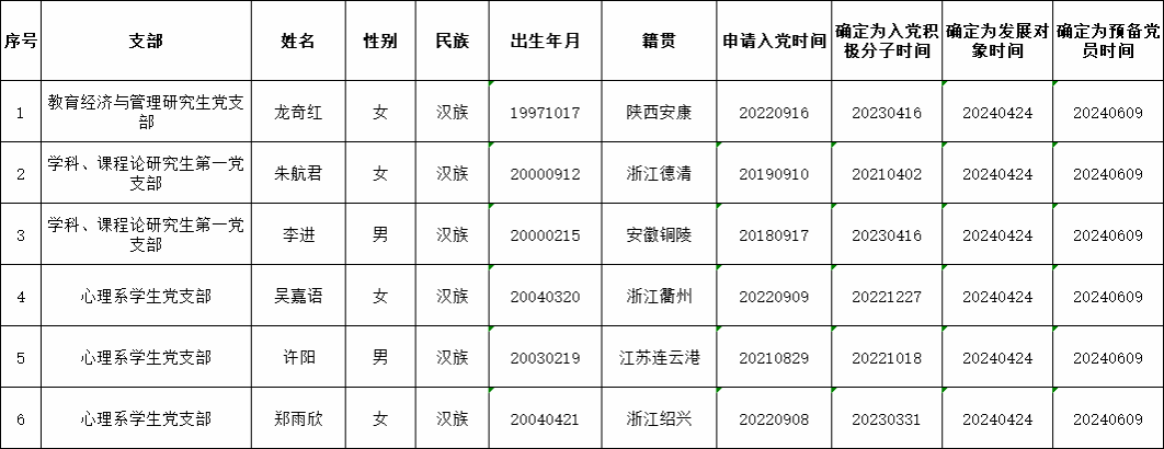 根据《中国共产党发展党员工作细则》中发展党员的文件要求,经对龙奇红等30名同志的接收为中共预备党员条件、接收程序等进行严格审查。2024年6月19日,学院党委会集体审议讨论了龙奇红等30名同志的接收问题。党委委员共7名,实到会7名。经逐个审议和表决,7名党委委员一致认为龙奇红等30名同志已具备预备党员条件,同意批准接收为中共预备党员,预备期为2024年6月9日至2025年6月8日。具体名单公布如下: