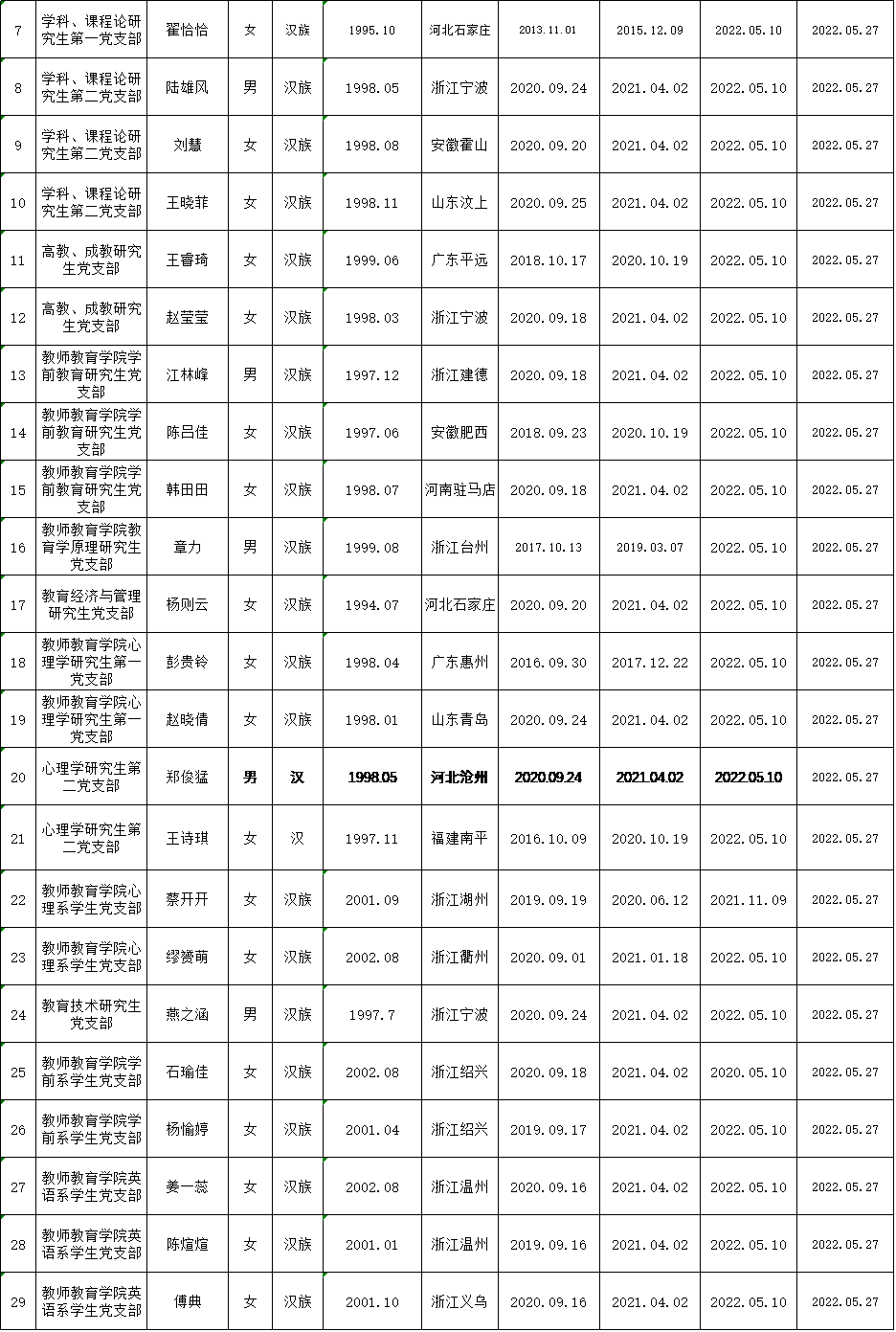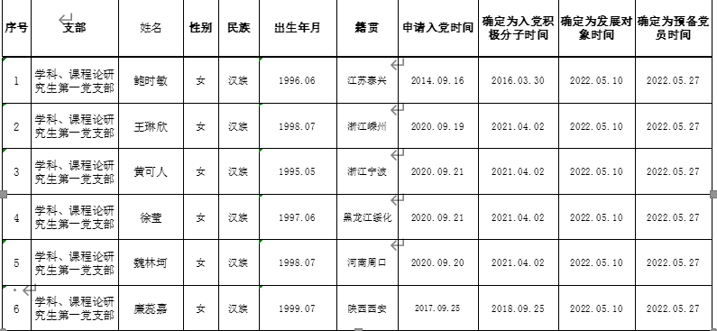 根据《中国共产党发展党员工作细则》中发展党员的文件要求,经对鲍时敏等40名同志的接收为中国预备党员条件、接收程序等进行严格审查。2022年6月7日,学院党委会集体审议讨论了鲍时敏等40名同志的接收问题。党委委员共7名,实到会7名。经逐个审议和表决,7名党委委员一致认为鲍时敏等40名同志已具备预备党员条件,同意批准接收为中共预备党员,预备期为2022年5月27日至2023年5月26日。具体名单公布如下:
