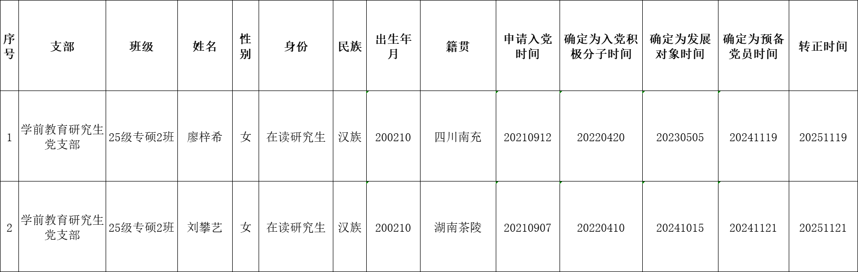 根据《中国共产党发展党员工作细则》中发展党员的文件要求,经对廖梓希等2名同志的预备党员转正条件、转正程序等进行严格审查。2025年11月25日,学院党委会集体审议讨论了廖梓希等2名同志的转正问题。党委委员共7名,实到会6名,1名委员因公务冲突请假。经逐个审议和表决,实到会的6名党委委员一致认为廖梓希等2名同志已具备正式党员条件,同意批准按期转为中共正式党员,党龄从预备期满转为正式党员算起。具体名单公布如下: