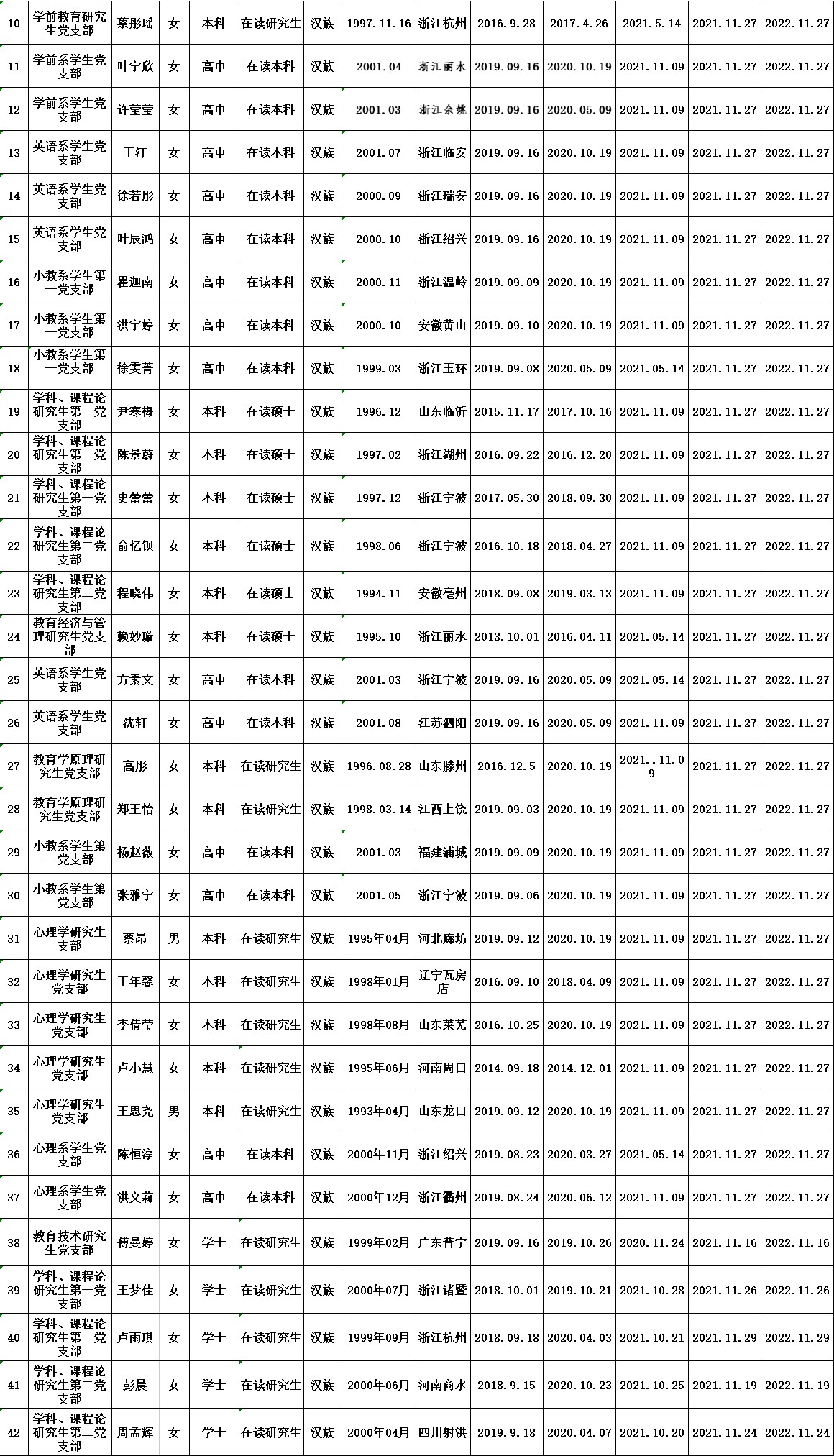 根据《中国共产党发展党员工作细则》中发展党员的文件要求,经对陈栩儿等42名同志的预备党员转正条件、转正程序等进行严格审查。2022年11月30日,学院党委会集体审议讨论了陈栩儿等42名同志的转正问题。党委委员共7名,实到会7名。经逐个审议和表决,7名党委委员一致认为陈栩儿等42名同志已具备正式党员条件,同意批准按期转为中共正式党员,党龄从预备期满转为正式党员算起。具体名单公布如下: