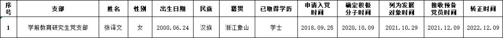 根据《中国共产党发展党员工作细则》中发展党员的文件要求,经对张译文同志的预备党员转正条件、转正程序等进行严格审查。2022年12月20日,学院党委会集体审议讨论了张译文同志的转正问题。党委委员共6名,实到会6名。经逐个审议和表决,6名党委委员一致认为张译文同志已具备正式党员条件,同意批准按期转为中共正式党员,党龄从预备期满转为正式党员算起。具体名单公布如下: