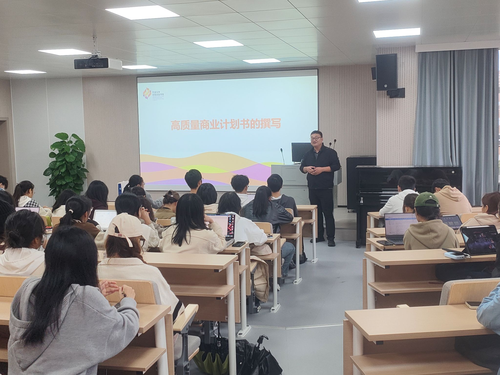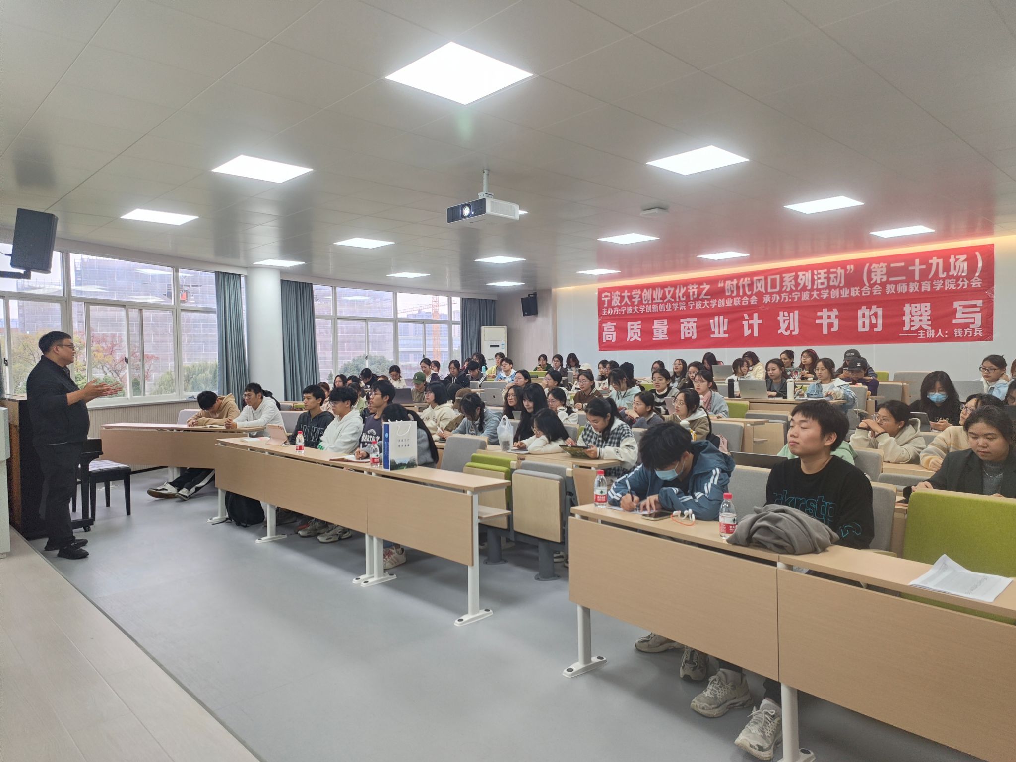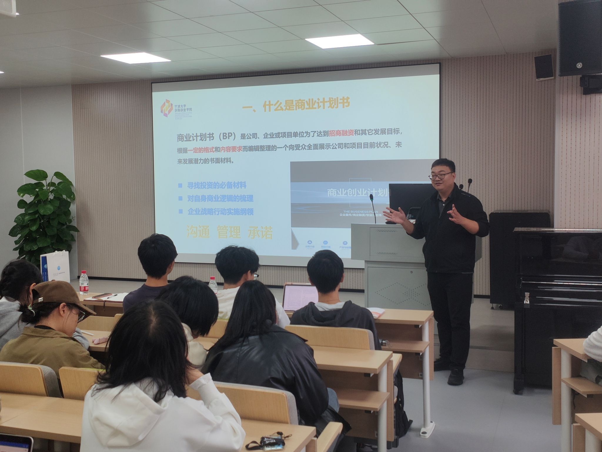 创新创业学院的钱方兵老师。讲师为同学们普及了撰写商业计划书相关知识,解答学生在有关商业计划书面的的疑惑,鼓励和帮助大家写出更高质量的商业计划书。钱方兵老师列举多个例子为我们生动的讲解了撰写商业计划书的步骤,先是认清商业计划书的对象,比如企业家和投资人的区别。接着,钱方兵老师指出了项目主要存在的三种问题,减少同学们撰写的失误,并阐释了好的商业计划书所应该具备的四个特点,让同学们有更明确的撰写商业计划书的方向。而后,通过对高质量商业计划书重点和内容的讲解,钱老师让同学们更深入地了解了商业计划书不同板块的要求,比如PPT的页数、封面的名字、市场分析和运营模式等。同学们通过本次讲座更好地充实了关于商业计划书的知识,也帮助他们在日后撰写高质量商业计划书时能有更充分的准备。