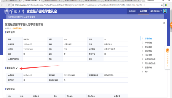 1、 学生筛选出来后,点击某学生申报记录前的“详情”按钮进入某学生家庭经济