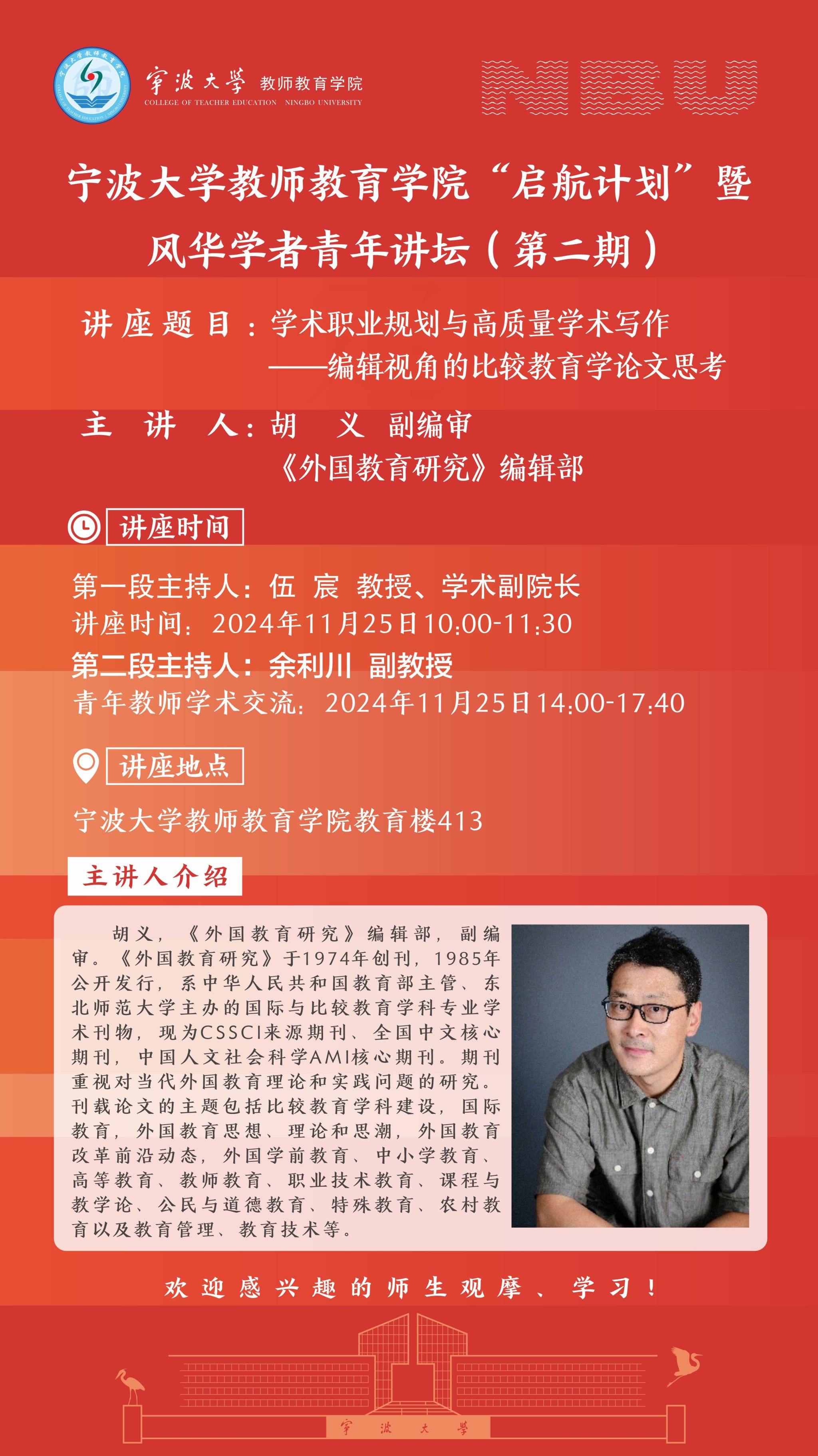 主讲人:胡义,《外国教育研究》编辑部,副编审。《外国教育研究》于1974年创刊,1985年公开发行,系中华人民共和国教育部主管、东北师范大学主办的国际与比较教育学科专业学术刊物,现为CSSCI来源期刊、全国中文核心期刊,中国人文社会科学AMI核心期刊。期刊重视对当代外国教育理论和实践问题的研究。刊载论文的主题包括比较教育学科建设,国际教育,外国教育思想、理论和思潮,外国教育改革前沿动态,外国学前教育、中小学教育、高等教育、教师教育、职业技术教育、课程与教学论、公民与道德教育、特殊教育、农村教育以及教育管理、教育技术等。