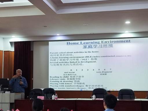 随后,Melhuish教授登上讲台,就儿童早期经验、神经科学与长期发展之间的关系进行了深入阐述。他结合自己多年的研究成果,详细解读了儿童早期经验对大脑发育和长期发展的重要性,强调了环境,特别是家庭环境对婴幼儿、儿童乃至青少年在社会情感、语言、认知等方面的关键影响,同时也提出了如何通过高质量的早期教育弥补弱势群体幼儿的发展不足,其中最为关键的要素是持续的分享互动。他以丰富的国际研究经验和深厚的学术造诣,为与会者带来了一场深入浅出的学术报告。