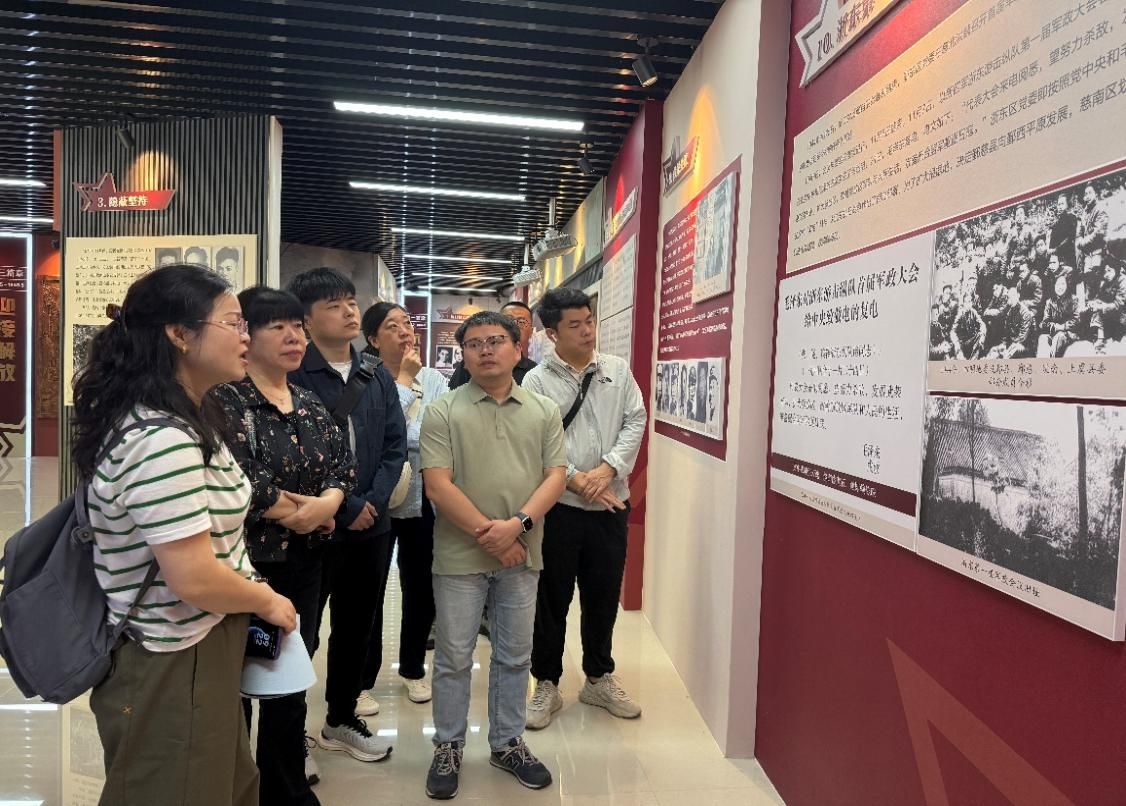 上午9时,党支部成员在浙东抗日根据地纪念碑前举行庄严仪式。支部书记戴洪珠老师带领大家重温入党誓词,铮铮誓言在苍松翠柏间回荡。随后,在支部副书记余利川老师的引导下,同志们依次参观了“星火燎原”“铁军纵横”“黎明曙光”三大主题展馆,通过200余件珍贵文物、30余处场景复原,系统学习了新四军浙东游击纵队在陆埠地区开展抗日斗争的光辉历史。