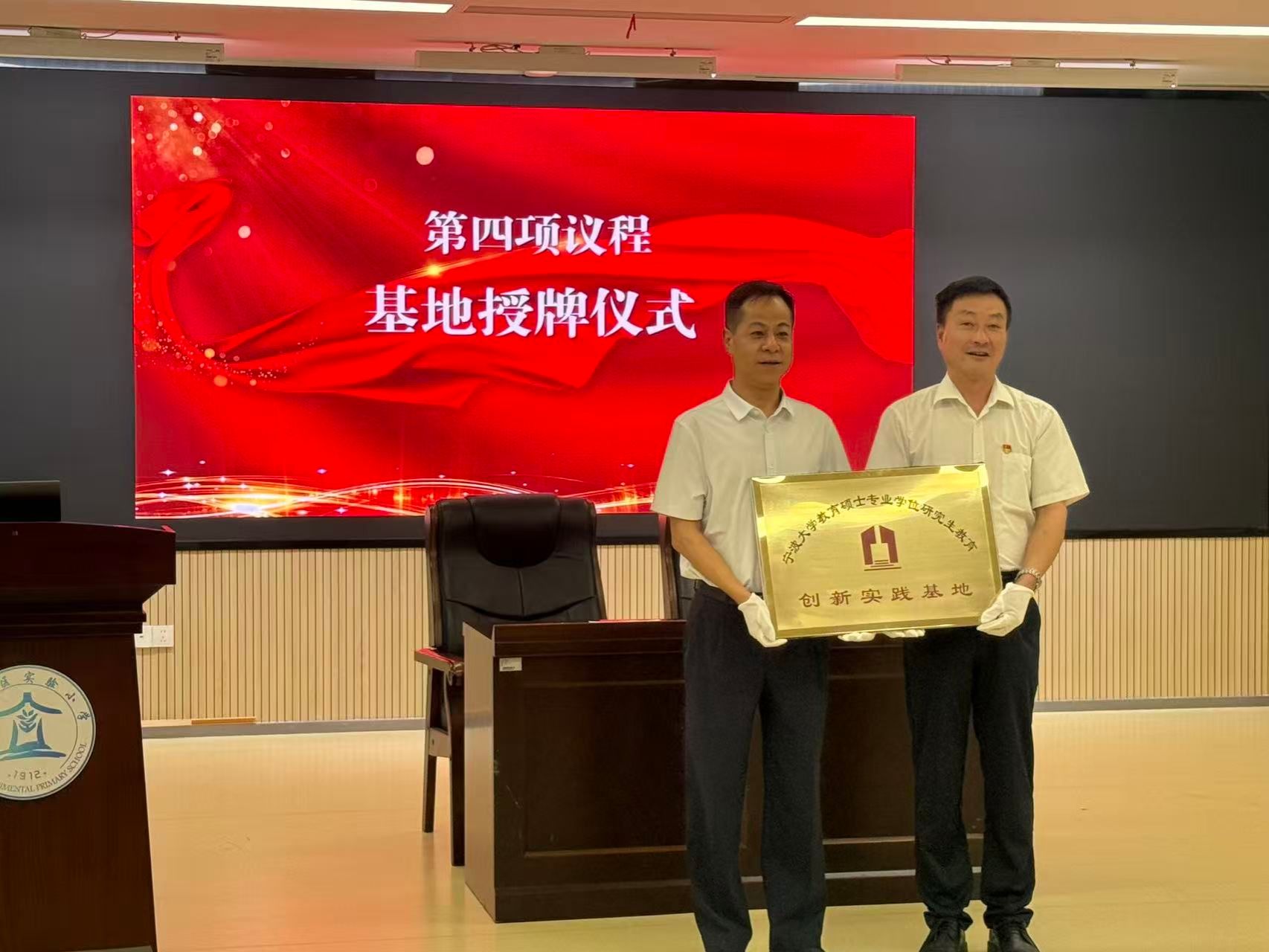 教育硕士实践基地协议”,以书面形式延续双方合作的同时,进行实践基地的授牌。授牌仪式后,镇海区实验小学韩亚斌书记发表讲话,他回顾了学校的发展历程与办学特色,并鼓励所有实习生积极融入校园,在实践中快速成长。接着,教育硕士实习生代表发言,真挚表达了对本学期实习的期待与向往,承诺将以饱满的热情、认真的态度投入实习工作,珍惜实践机会,努力提升自身素养。仪式尾声,郑建伟校长宣布实习指导教师名单。