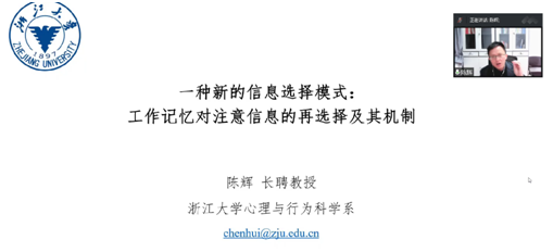 众所周知,人类的认知资源是有限的,而我们所面临的世界却是广袤的,那么如何解决人感知到的几乎无限的信息与自身有限的认知资源之间的冲突呢?陈辉教授认为,解决这一问题的关键则在于厘清人是如何进行选择性加工的。基于此,陈辉教授向与会人员分享了一系列研究:第一部分为经典注意选择理论及其机制,第二部为工作记忆对注意信息的再选择及其机制。在第一部分中,陈辉教授具体介绍了以下内容:选择性注意的经典范式、注意缺失导致的盲视现象、记忆编码损耗理论、注意增强如何实现的、注意选择的三阶段模型和计算模型。第二部分中,梳理经典的注意研究发现后陈辉教授团队提出了新的假设,即注意到的信息,在其进入到工作记忆时也会受到记忆的再选择。此外,还介绍了属性失忆现象,探讨了关键特征是否被存储在工作记忆、已注意信息是否一定被存储在工作记忆、大脑是否对不再相关的已注意信息进行主动抑制、比较关键特征和无关特征的工作记忆引导注意效应等问题。陈辉教授从经典注意范式中提出的新理论为信息选择模式做出了强大的理论贡献。