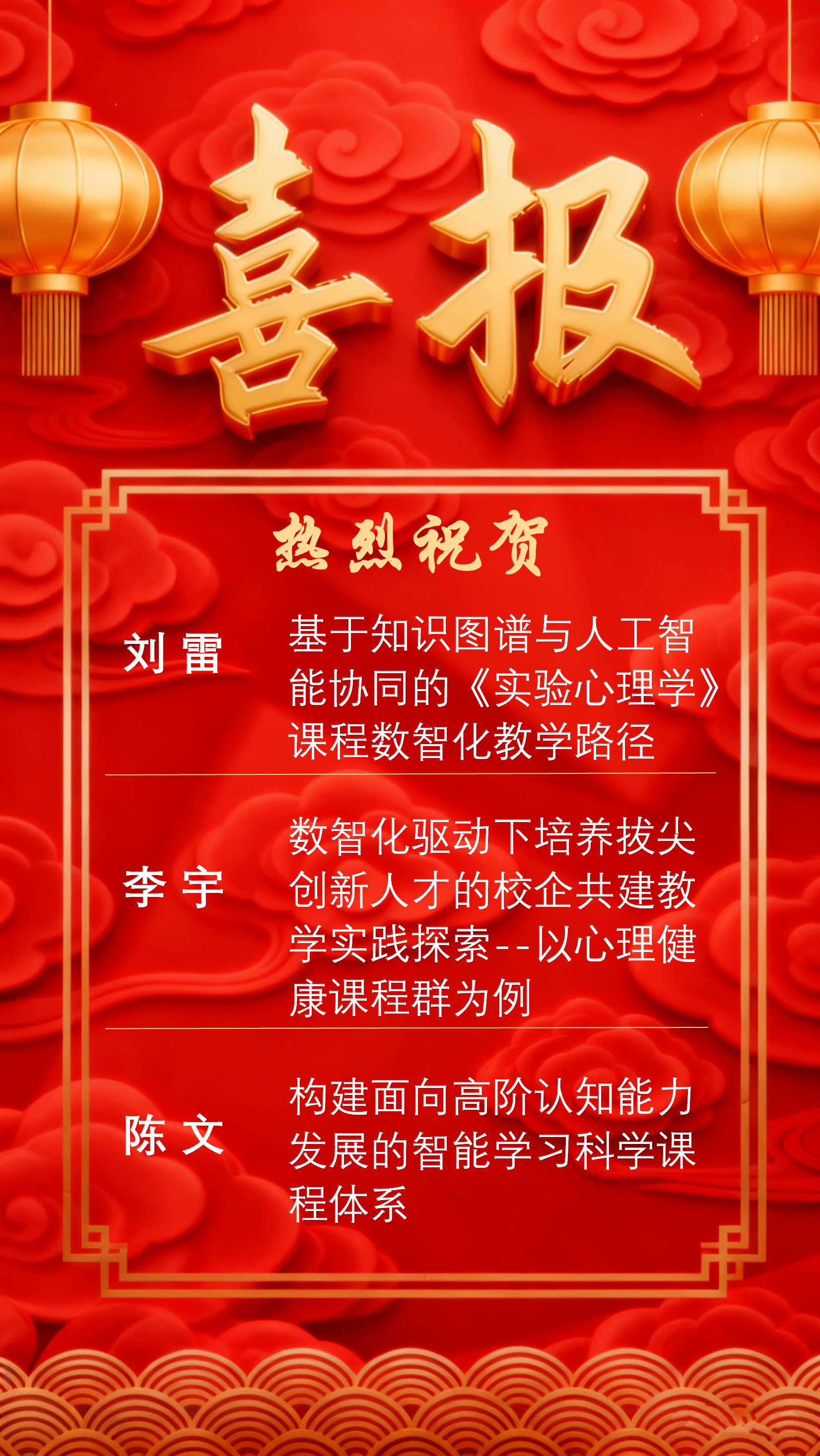 刘雷老师主持的《基于知识图谱与人工智能协同<实验心理学>课程数智化教学路径》、李宇老师主持的《数智化驱动下培养拔尖创新人才的校企共建教学实践探索——以心理健康课程群为例》和陈文老师主持的《构建面向高阶认知能力发展的智能学习科学课程体系》分别获课程建设类、实验实践教学类和获招标类项目立项。三项课题的同时获批,充分展现了心理学系教师在教育教学改革方面的创新活力与研究实力。