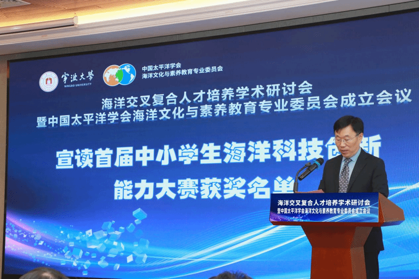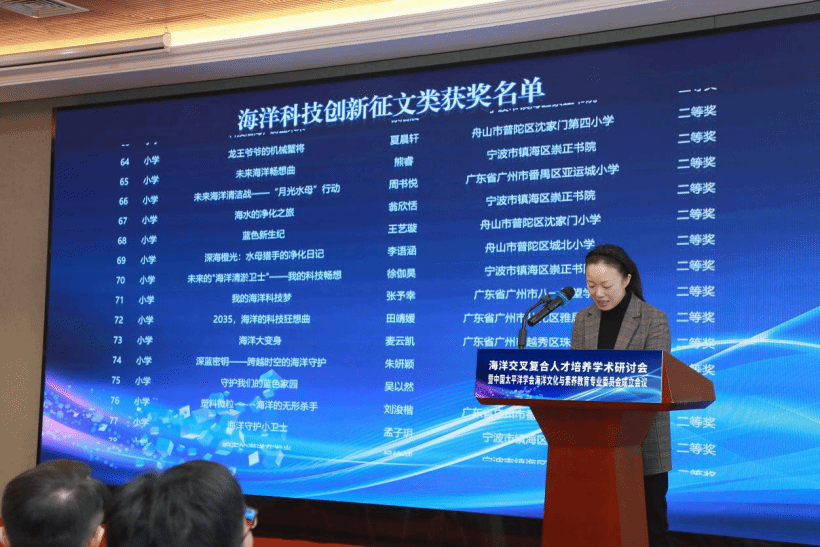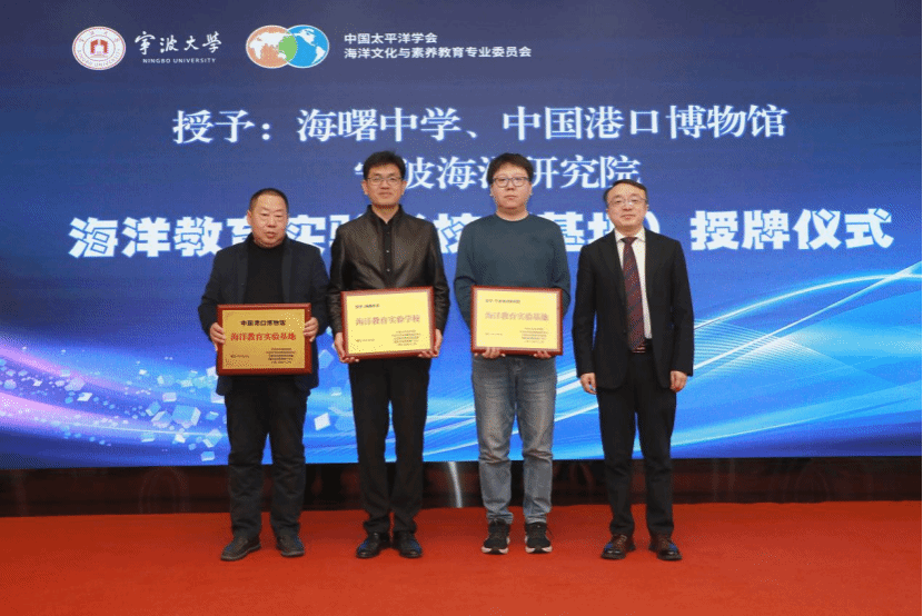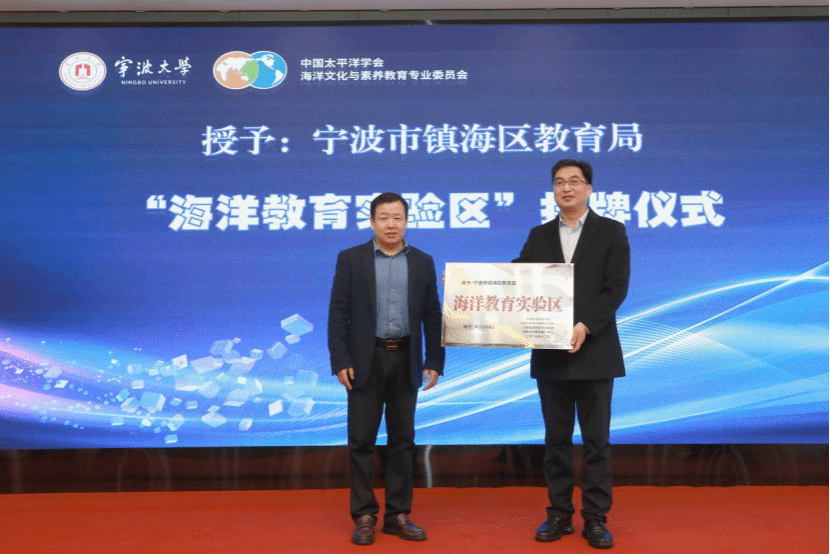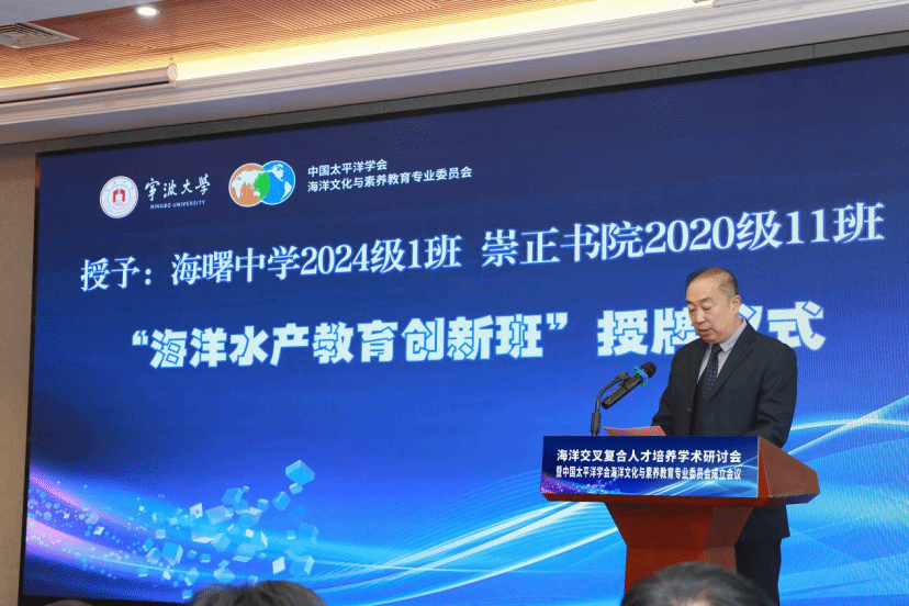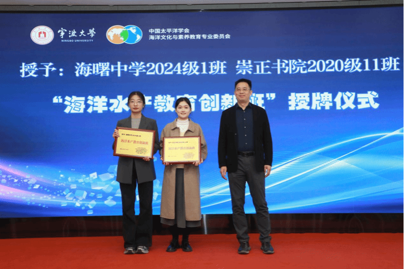 副校长李伟平教授向宁波市镇海区教育局党委委员、总督学王海颁发“海洋教育实验区”牌匾,镇海区也成为全国第二家海洋教育实验区。会议举行了“海洋教育实验学校(基地)”“海洋水产教育创新班”授牌仪式。海曙中学被授予“海洋教育实验学校”,中国港口博物馆、宁波海洋研究院被授予“海洋教育实验基地”;海曙中学2024级1班和崇正书院2020级11班被授予“海洋水产教育创新班”。