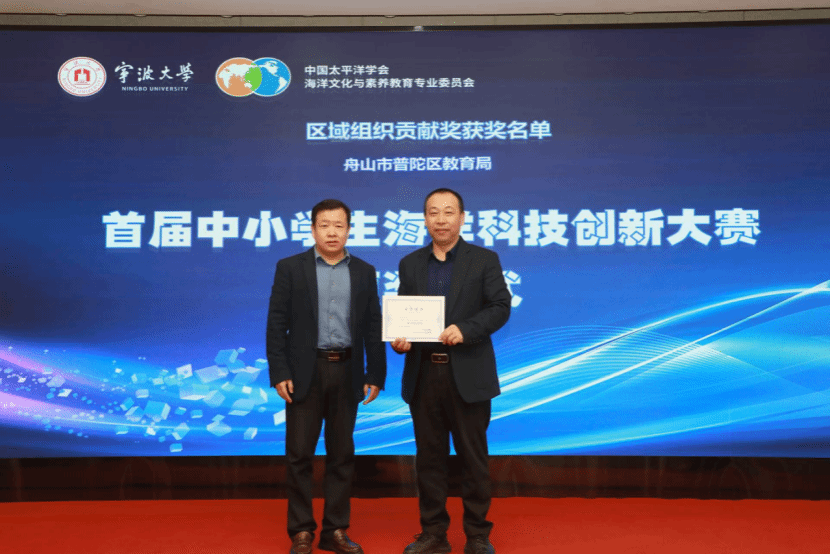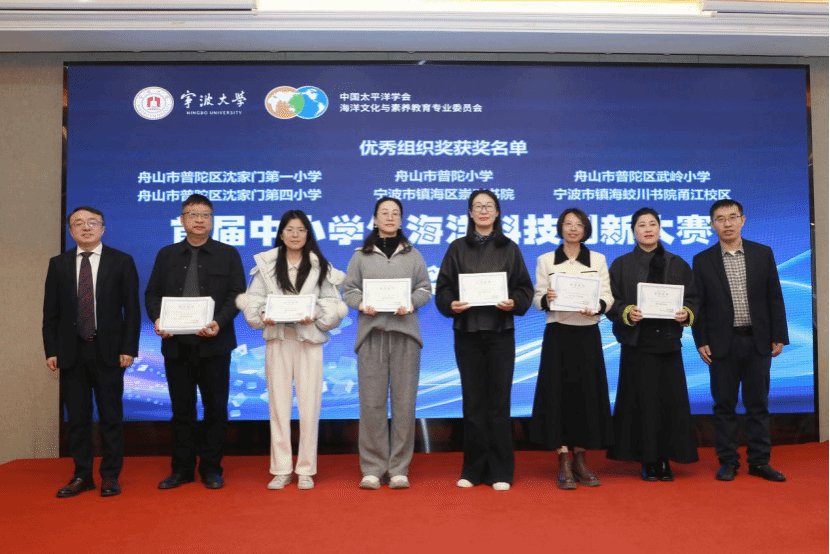 督评中心主任刘训华教授共同为获得优秀作品和优秀组织奖的单位代表颁奖,舟山市普陀区沈家门第一小学、舟山市普陀区武岭小学、舟山市普陀小学、舟山市普陀区沈家门第四小学、宁波市镇海蛟川书院甬江校区、宁波市镇海区崇正书院等获奖学校负责人上台领取优秀组织奖和优秀作品证书。此次大赛吸引了众多中小学生参与,涌现出一批兼具创意与科学性的海洋科技创新作品,充分展现新一代青少年的海洋探索精神。