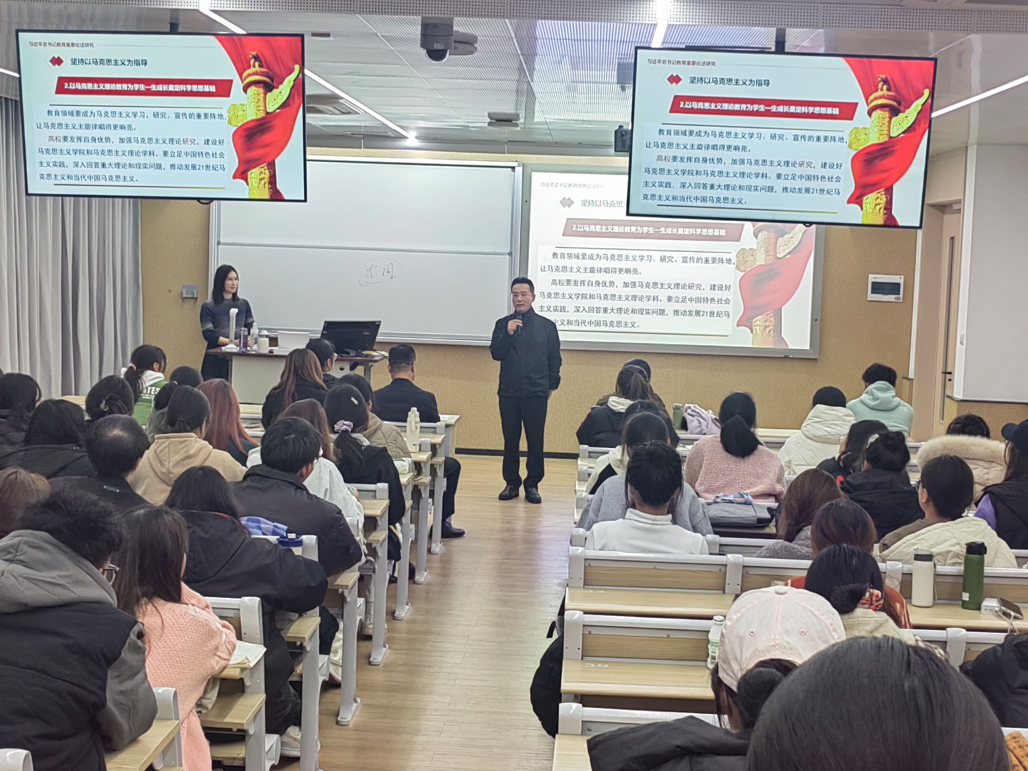 课上,孙立新教授从中国坚持社会主义办学方向的内涵、进程及历史意义,中国办学为什么要坚持社会主义方向,坚持教育的“四为服务”三方面出发,清晰地阐述了我国教育最鲜明的底色--坚持社会主义的办学方向。