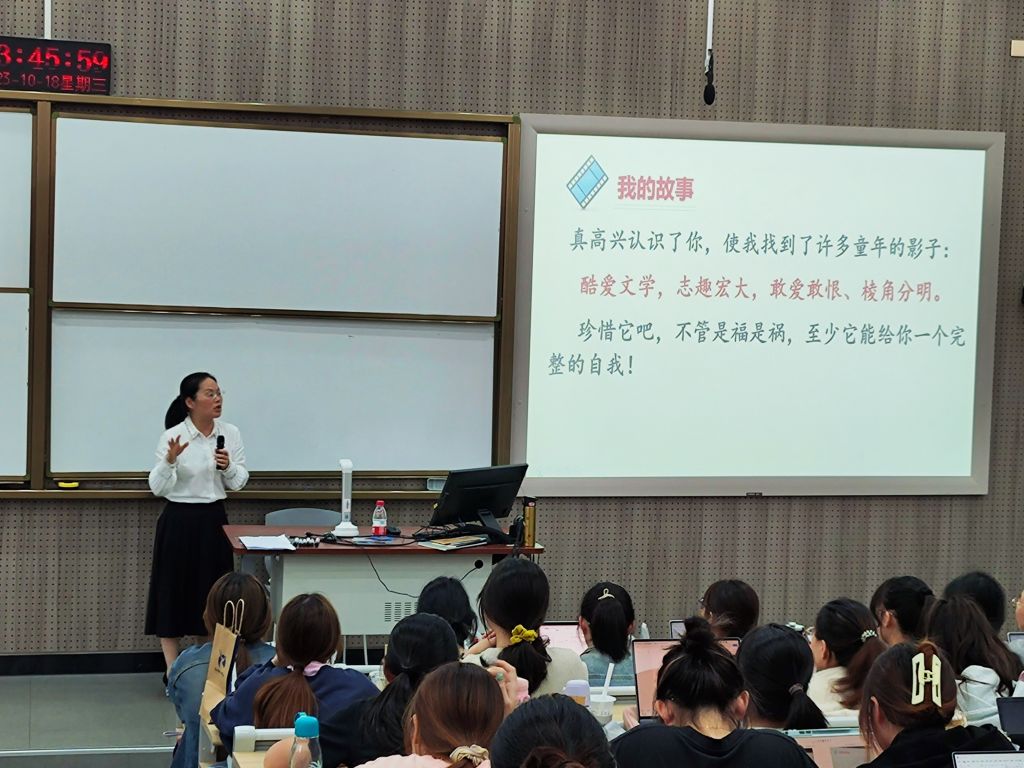 讲座期间,蓝老师用生动轻松的话语营造了一个愉悦的氛围。她首先分析了在时代的大背景下,刚刚出台的与班主任相关的最新文件,提出班主任要做学科教师、德育教师和人生导师。然后蓝老师通过台湾作家三毛和席慕蓉童年学数学遇到不同态度的数学老师这两个故事,对比强调教师教育态度的重要性。