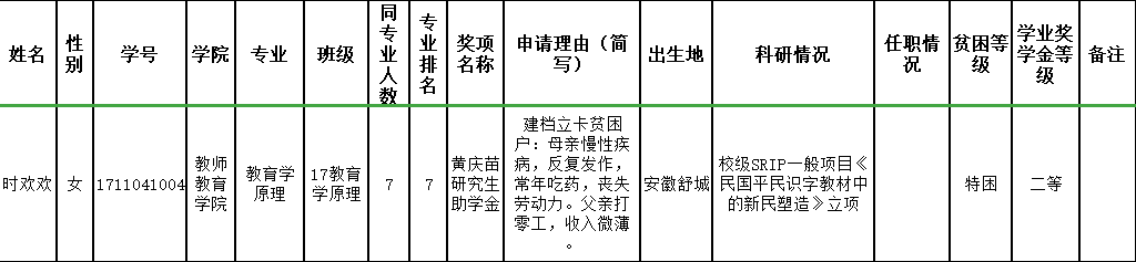 研究生院考虑到樱花小说 研究生贫困生总量较大,给予樱花小说 增补一名“绣山清寒优秀学生奖学金”名额。学院研究生奖助学金评审委员会办公室根据前期申报情况,拟推荐时欢欢为“绣山清寒优秀学生奖学金”推荐学生,现予以公示。