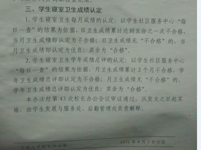 根据宁大政〔201623号文件《关于印发〈樱花小说 学生寝室卫生检查实施办法(试行)的通知〉》要求,学生社区负责对学生寝室卫生进行检查。学院每周三进行寝室卫生的常规检查,学校和学院的卫生检查结果共同计入当月寝室卫生成绩的考核。具体考核原则如下: