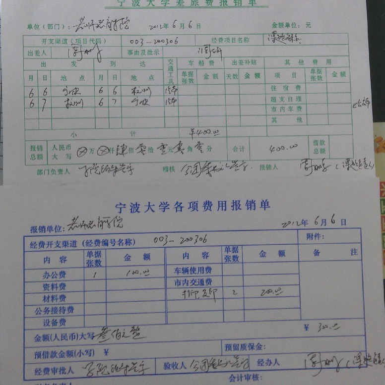 4.报销发票内容:论文发表版面费,办公用品,打印、复印费,调研车旅费。