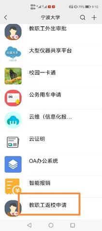 1.离甬(浙)教职工。广大教职工离甬(浙)需履行外出审批手续,审批通过后校内人员电子通行证关闭,外出教职工准备返校前,需在返校前一天提交返校申请,待申请通过后开通校内人员电子通行证。