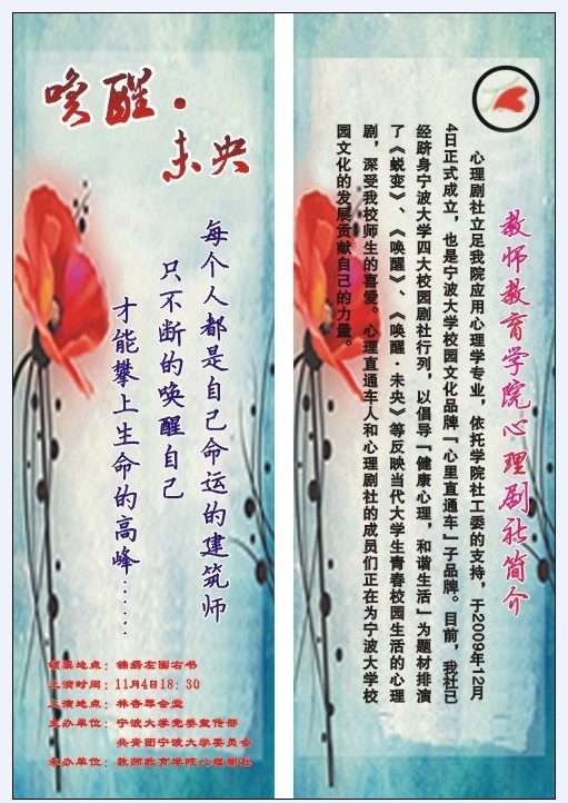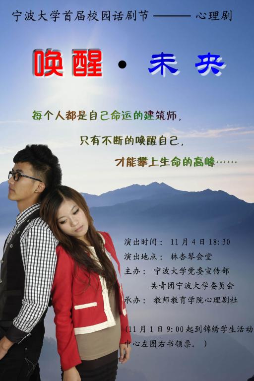 首届校园话剧节之心理剧《唤醒 未央》将于2010年11月4日(周四)下午18:30在林杏琴上演,本剧是樱花小说