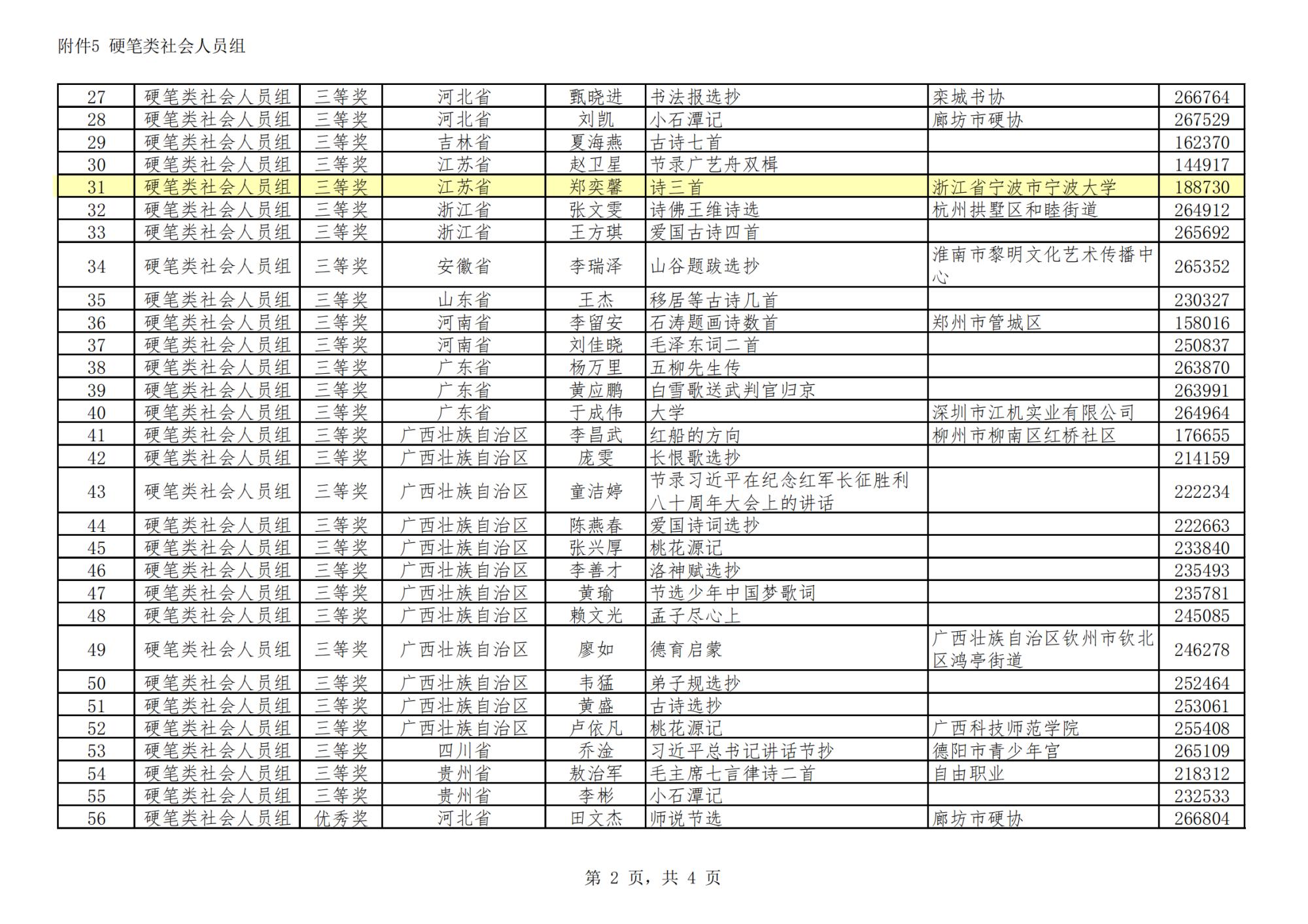 独占3位,寿文彪、吴昱茹荣获三等奖,梁羽彤荣获优秀奖,另外郑奕韾荣获社会组三等奖(名额所限报社会组,社会组一、二、三等奖共55人)。