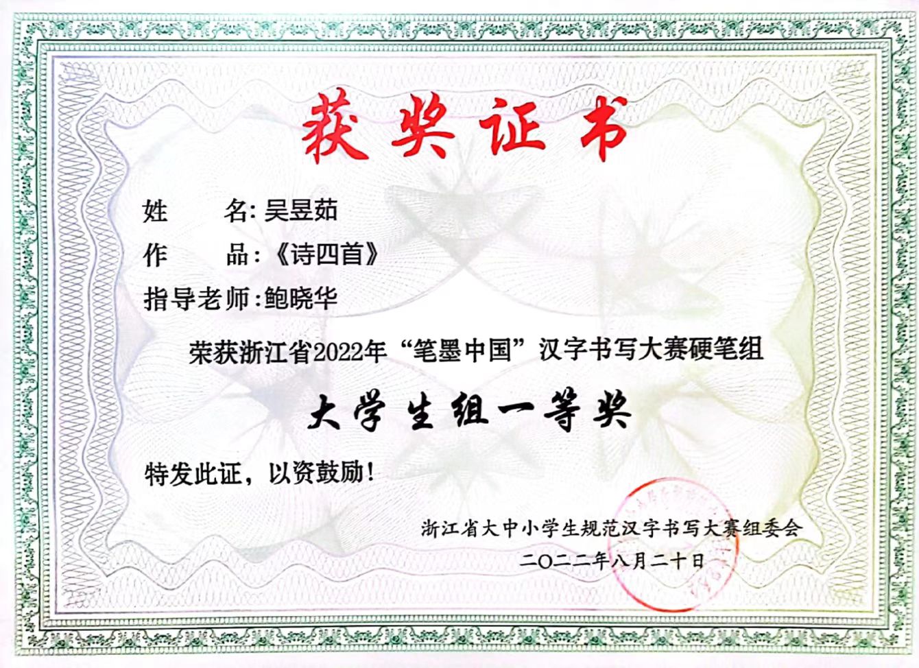 图7 吴昱茹省赛一等奖证书