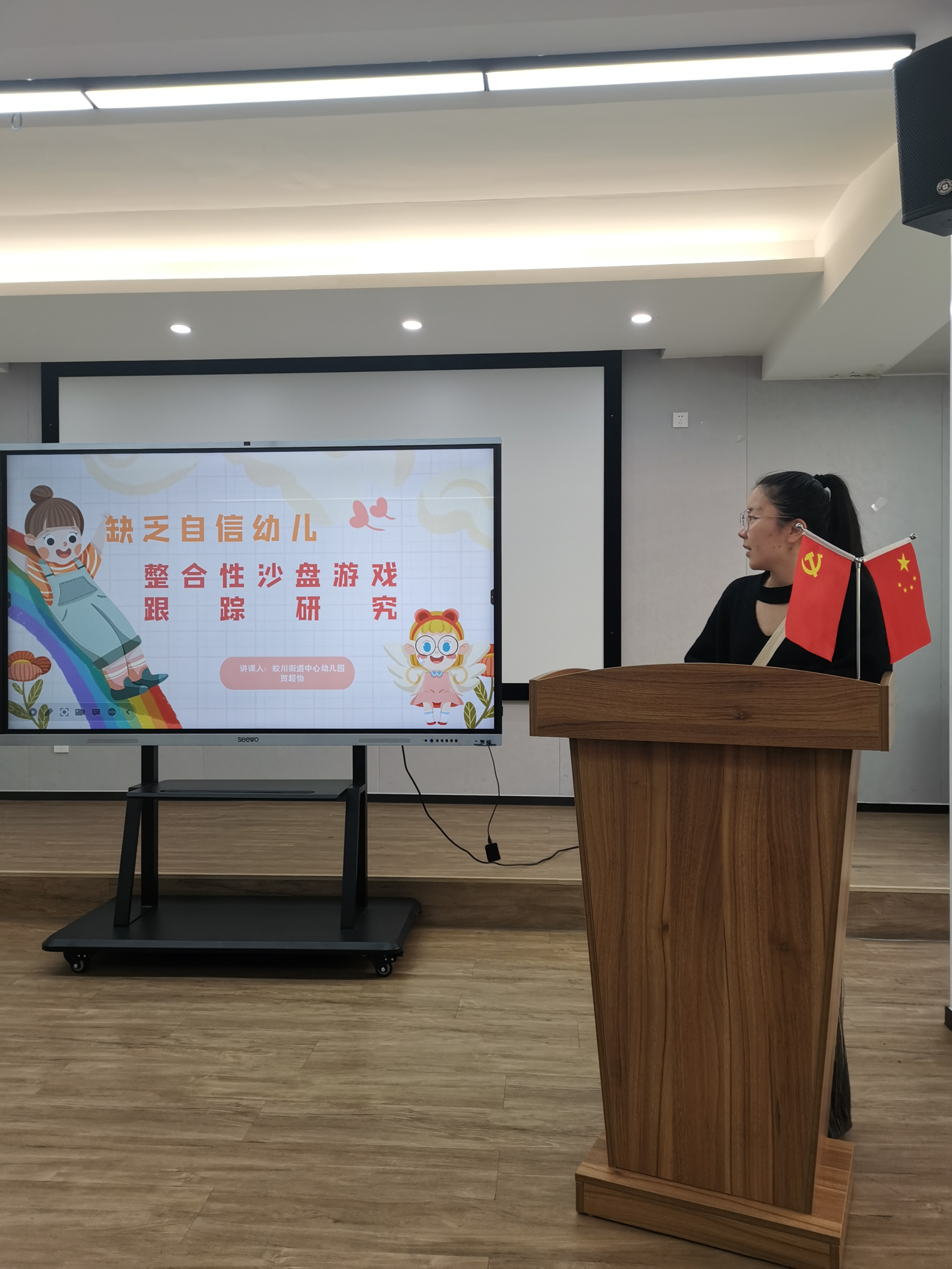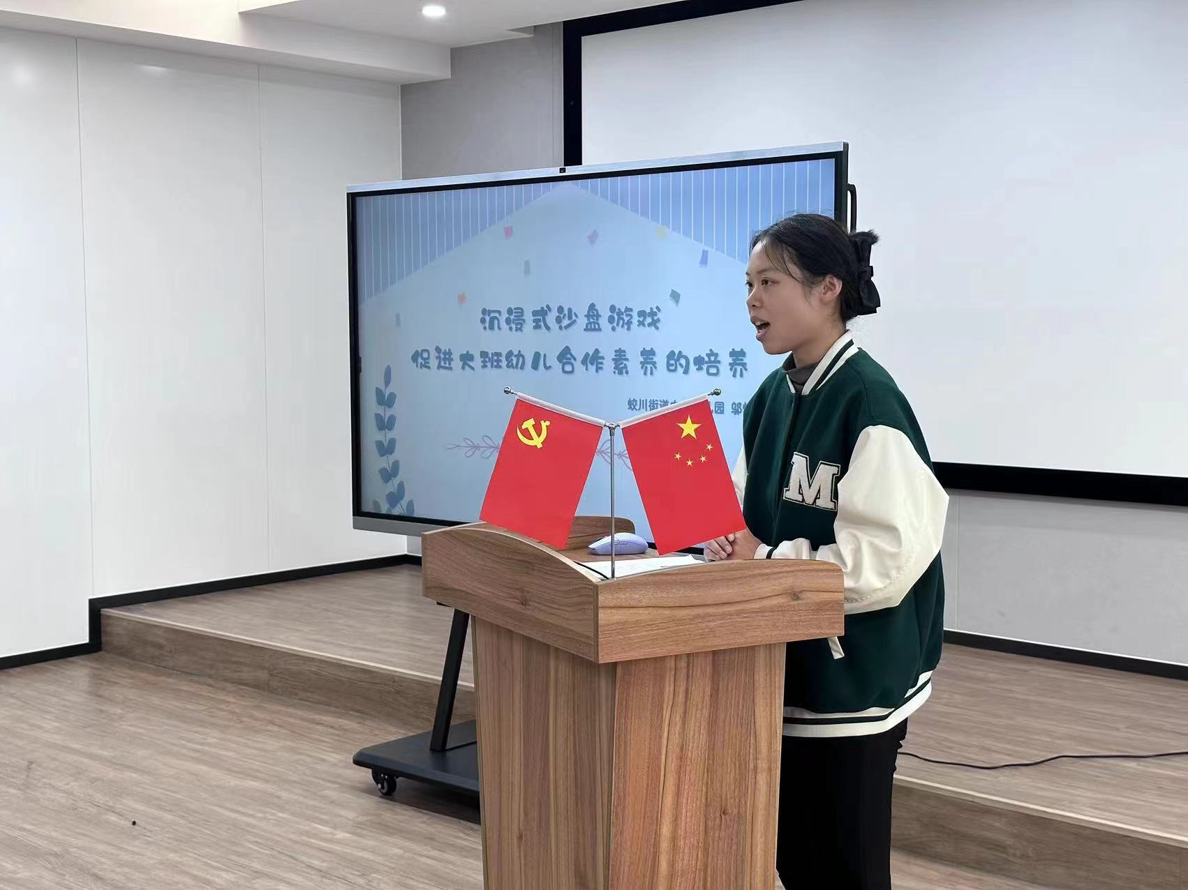 贺超怡老师以《感统失调儿童整合性沙盘游戏跟踪研究》为题进行了分享,以沙盘游戏为工具帮助缺乏自信幼儿表达自己的想法。邬怡婷老师以《体验式沙盘游戏中幼儿合作行为的培养研究》为题进行了介绍,提出对不同性格幼儿的语言引导,引导幼儿在沙盘游戏中通过完整场景的达成来培养幼儿的合作行为。